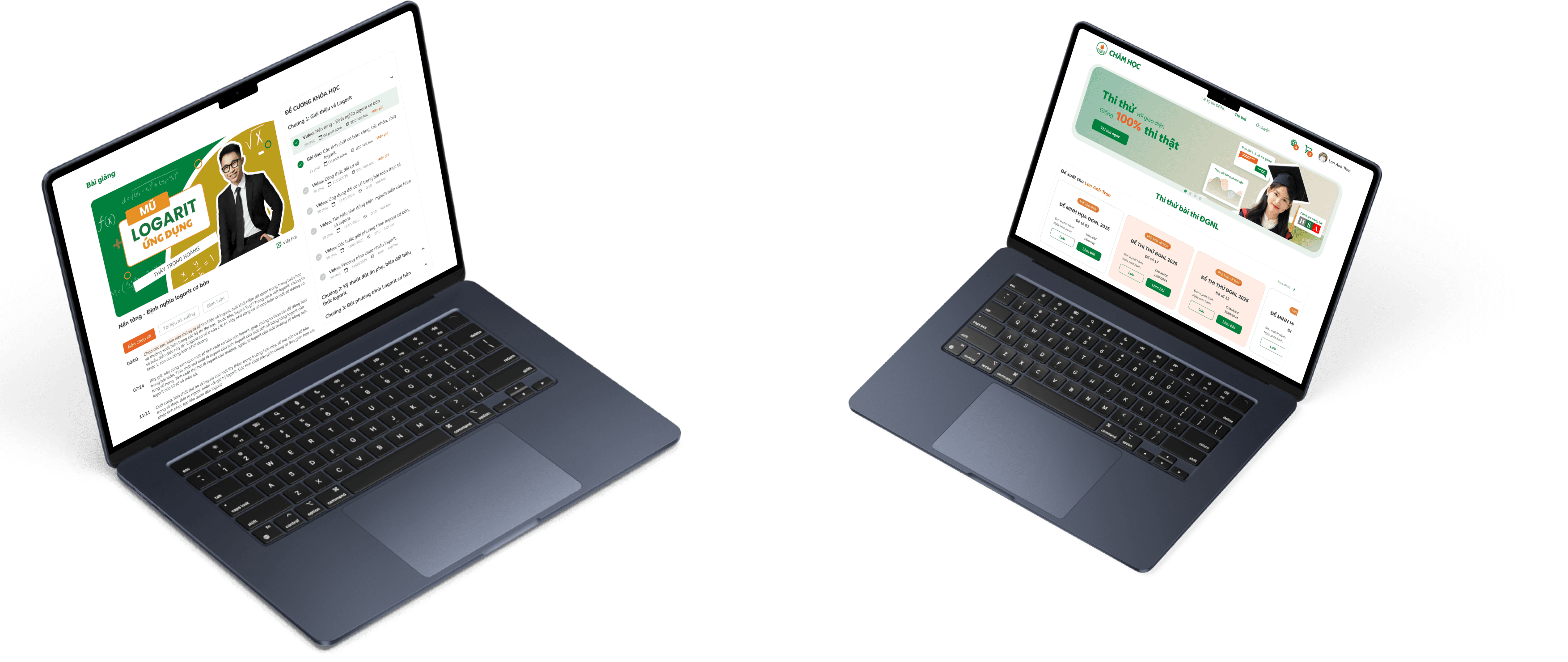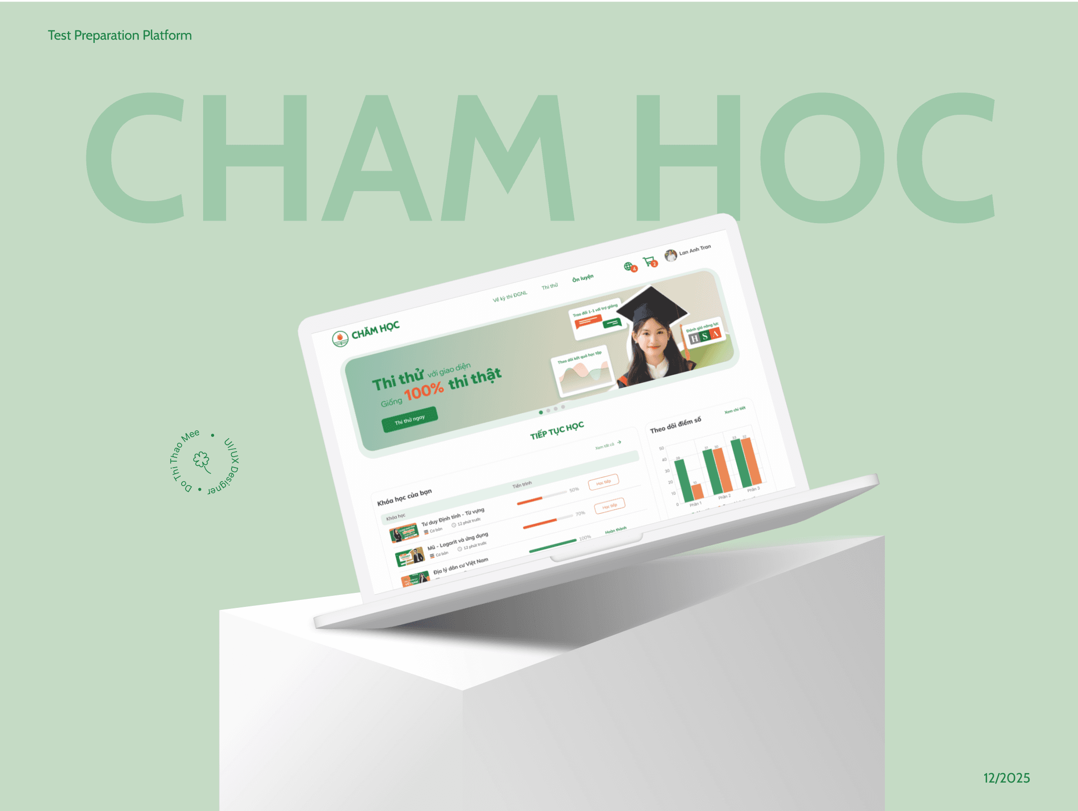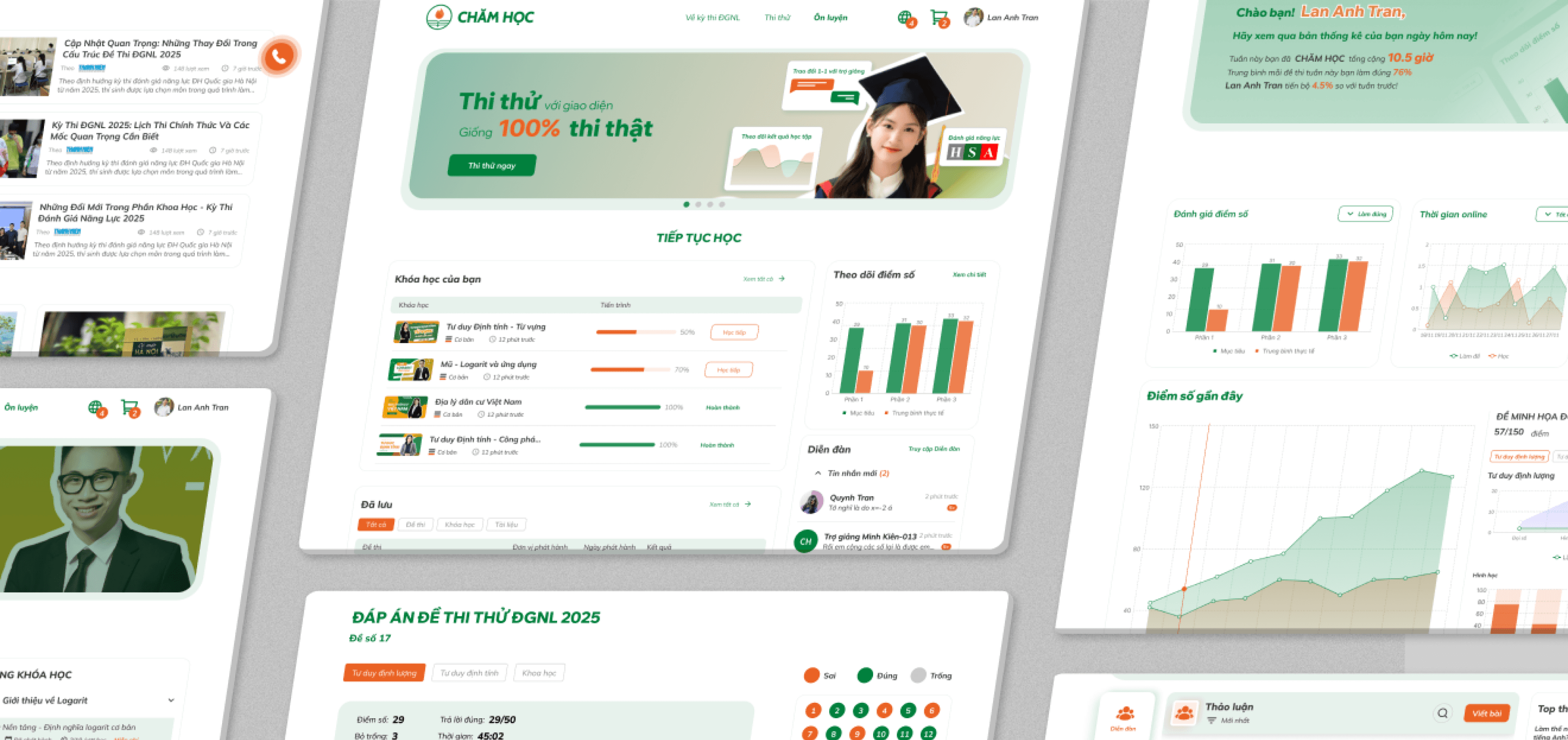 CHAM HOC is a clean, modern platform that builds trust and engagement through a bright design with warm green and orange accents, reflecting both energy and educational focus. The layout is clear and structured, with visual aids that make progress easy to track. It’s both functional and welcoming.