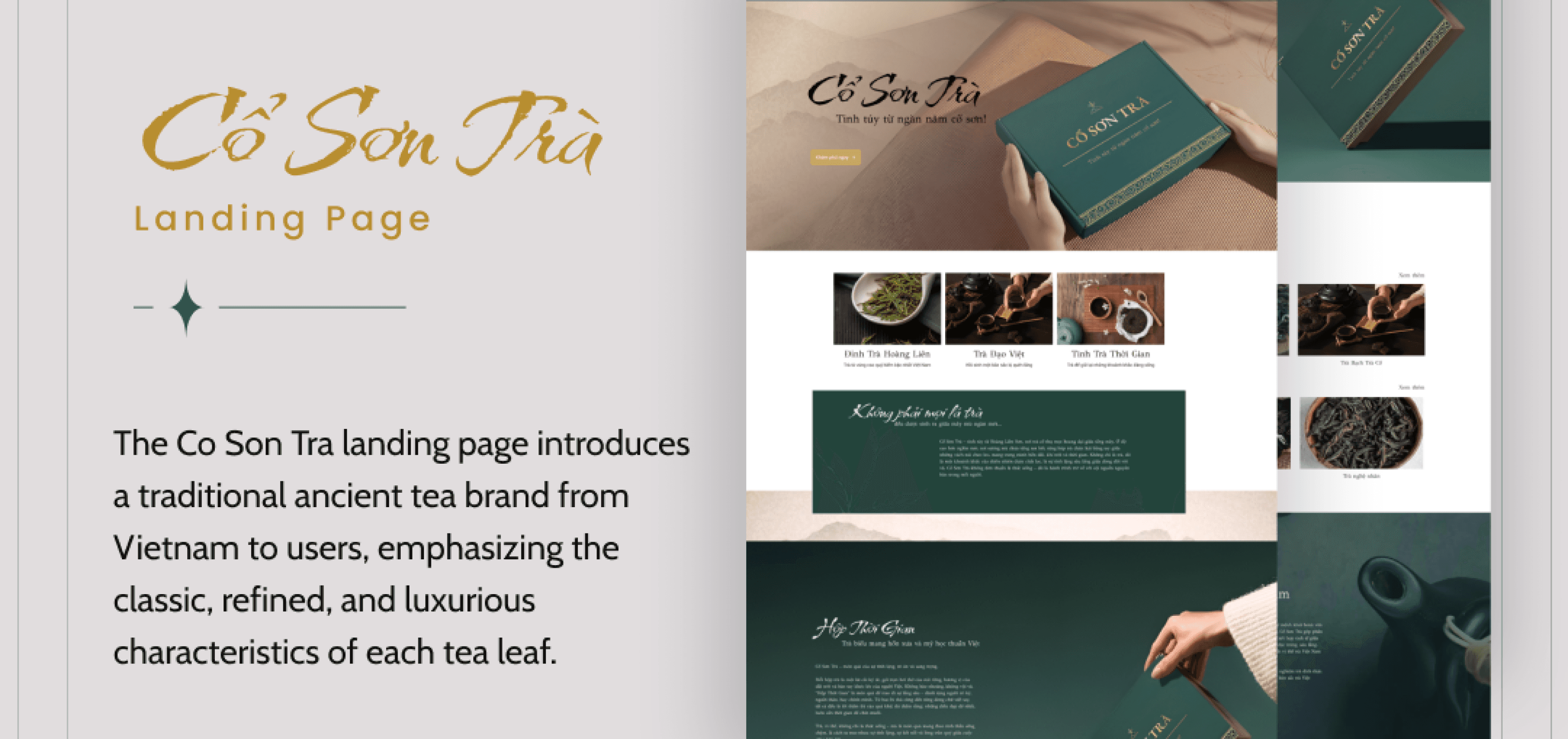 The use of photography featuring handcrafted tea rituals reinforces the brand’s focus on tradition and craftsmanship. Overall, Co Son Tra’s design exudes calm, refinement, and a deep connection to the heritage of Vietnamese tea.
